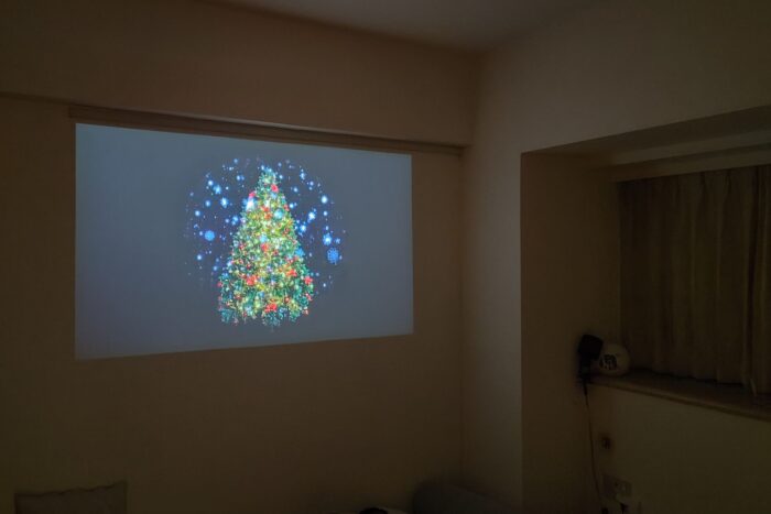 年末にはプロジェクターも導入し、寝ながら動画を楽しめるようになりました。動画好きな長男は、お風呂のあとにこの部屋でアニメを見るのを楽しみにしています。